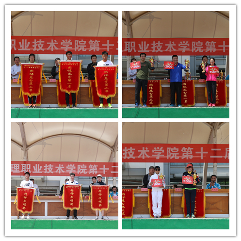 闭幕式上,运动会总裁判长夏飞宣布了竞赛团体总分成绩,旅游与酒店管理学院、工商管理学院、酒店工程学院获得学生组团体总分前三名,基础思政代表队、行政二队、行政一队获得教工组团体总分前三名;于敏宣布了获得精神文明奖的单位名单,旅游与酒店管理学院、工商管理学院、艺术学院获得学生组精神文明奖,艺术学院、酒店工程学院获得教工组精神文明奖。学院领导向获得运动会竞赛团体总分前三名和精神文明奖的单位颁发了锦旗。