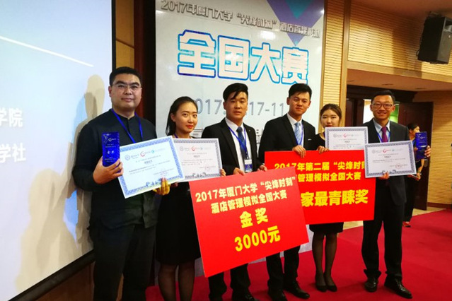 本网讯 (旅游与酒店管理学院 张峰) 1117日至19日,“尖烽时刻”第二届酒店管理模拟全国大赛决赛在厦门大学举办,我院由酒店管理专业学生李伟、李敬铁、马乙鑫与王艺颖组成的“东方精选”代表队荣获金奖与企业家最青睐奖,专业教师张峰、张朋荣获优秀指导教师荣誉称号。