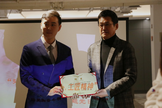 在展览中,艺术学院的优秀作品参与了展出,这些作品均出自老师和学生的手工制作,体现了师生的专业水准和制作水平。具有工匠精神的作品,其制作过程可体验到一种自然节律和人生况味,散发着劳动者的气质和热情,充满了人们对美好生活的寄托和向往。展览结束后,王文向青岛辰木元思文化有限公司负责人颁发了聘书,与该公司建立了校企合作关系。全体师生观摩了皮雕艺术设计师薛超的现场教学课程,并聘请其为兼职任课教师。