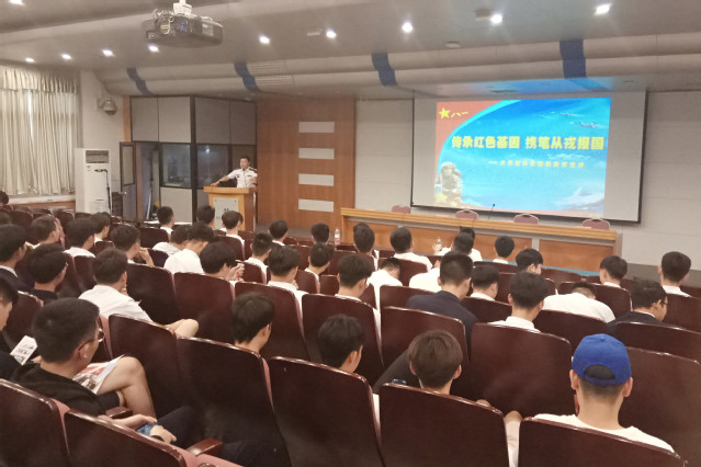 6月13日下午,海军潜艇学院政治工作处李鹏中校、潜艇兵训练基地教研室副主任张栋中校等一行四人来我院开展题为“传承红色基因 携笔从戎报国”的爱国主义讲座,旅游与酒店管理学院学生党支部全体成员及三百余名学生参加讲座。