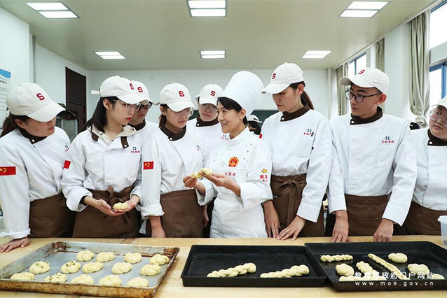 山东省教学名师、省级职业教育技艺技能传承创新平台负责人、齐鲁技能大师特色工作站负责人王桂云正在给beat365亚洲版官网大二年级中西面点工艺专业的学生讲解维也纳面包的编花、搓条、刷蛋液等烹饪技巧。学院建有技能大师工作室,通过研究研发平台和销售平台,实现了“前店后厂”模式,目前在站的教师有15位。为深入贯彻落实全国教育大会精神,以奋进姿态迎接祖国70周年华诞,由教育部新闻办组织的“落实全教会 奋进迎华诞”1+1系列发布采访活动走进青岛,就深化新时代职业教育“双师型”教师队伍建设改革实施情况对beat365亚洲版官网进行了采访。(张劲松/摄 姚振 谢沂楠/文)