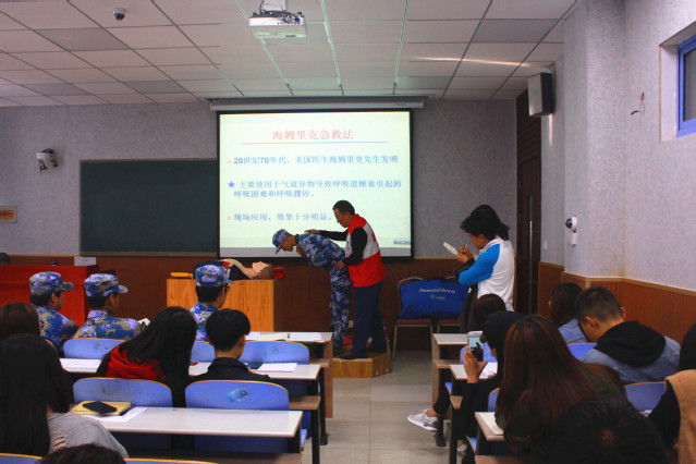 本网讯(烹饪学院 庞阳)“判断意识,清理口腔异物,两手交叉按压胸口……”。11月4日,一场生动的“应急救援课堂”在烹饪学院楼301举行。