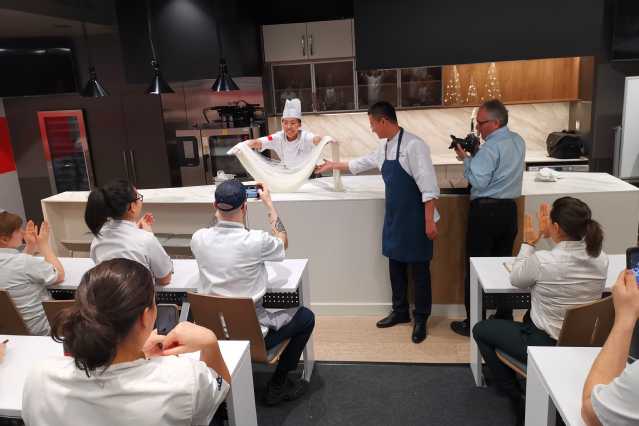 12月4日—5日,在烹饪学院院长王建明的带领下,学院展示了山东非物质文化遗产——饽饽榼子的使用及饽饽的制作,举行了“beat365亚洲版官网——山东非物质文化遗产传播中心”的挂牌仪式。烹饪学院专业教师王珊珊、李军、江云涛向ITHQ学院师生展示了中式面点的制作,与师生一起制作了中西融合的宴席。