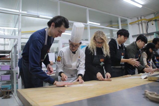 随后,外籍师生们来到烹饪学院西餐厅实训中心,通过烹饪大师和学生工作人员的亲手示范,学习了饽饽榼子的使用过程。在实践环节,外籍师生们开始大显身手,亲手制作出深藏青岛文化的“榼花”馒头,从和面到榼花,大家忙得不亦乐乎。看着大家亲手制作的榼花馒头出锅,每位师生都充满了成就感,大家津津有味地品尝着自己的劳动成果,体味浓浓的中国味道,同时围绕来华学习、工作和生活的感受进行交流。