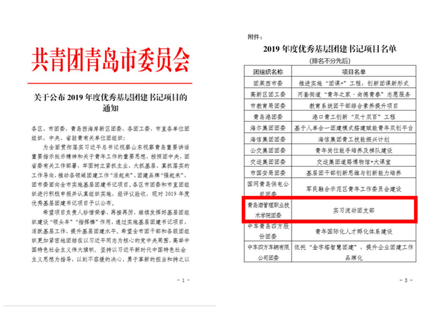 本网讯(旅游与酒店管理学院 张妍)近日,共青团青岛市委员会下发了《关于公布2019年度优秀基层团建书记项目的通知》,旅游与酒店管理学院“实习团支部”项目奖获评优秀,成为全部参选的103个项目中唯一获得“优秀”的高校项目。