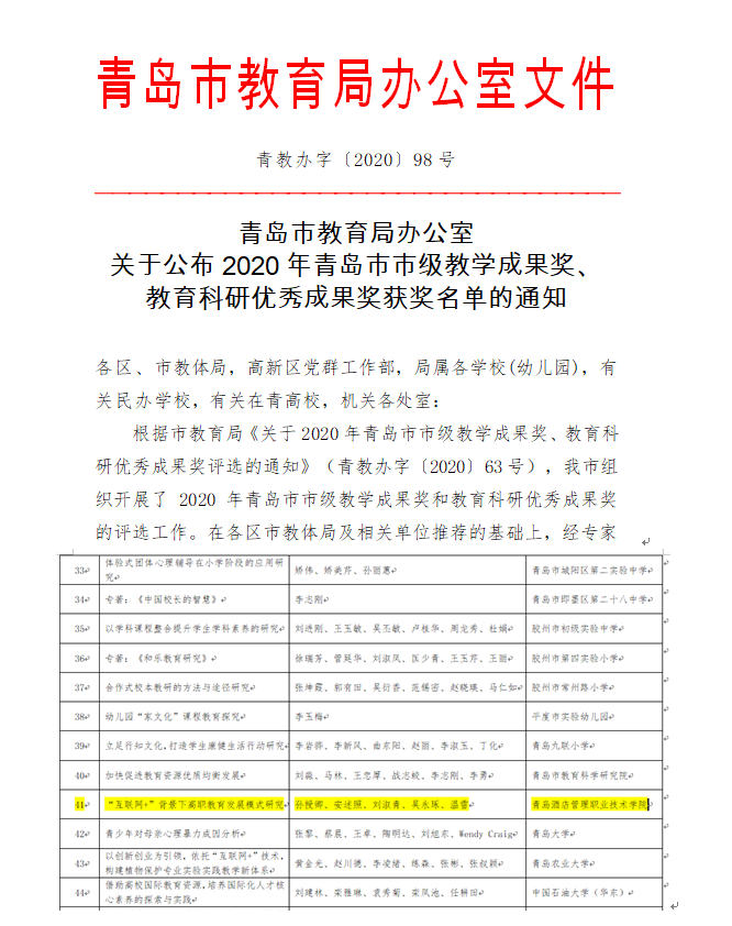 本网讯(科研发展处 刘淑青) 近日,青岛市教育局办公室公布了2020年青岛市市级教学成果奖、教育科研优秀成果奖获奖名单,学院孙授卿副教授主持完成的项目《“互联网+”背景下高职教育发展模式研究》获得青岛市教育科研优秀成果奖一等奖。