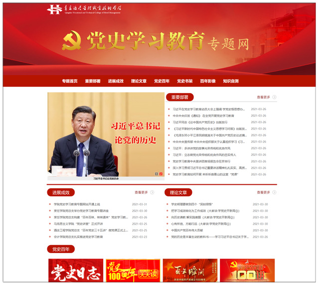 学院党史学习教育专题网站下设重要部署、进展成效、理论文章、党史百年、党史书架、百年影像、知识自测等栏目,集中传达习近平总书记对党史学习教育的全面动员部署以及党中央关于党史学习教育的重要精神,全方位展示学院党史学习教育重点工作进展情况,引导广大党员师生学史明理、学史增信、学史崇德、学史力行,以昂扬姿态投身到职业教育提质培优增值赋能和学院高质量发展中去。