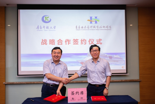 本网讯(酒店管理学院 滕柯) 6月10日上午,学院与青岛开放大学在旅游酒店实训中心多功能厅举行战略合作签约仪式。青岛开放大学校长张锡科、副校长孙明明,学院院长姜玉鹏、副院长张宗国参加签约仪式。