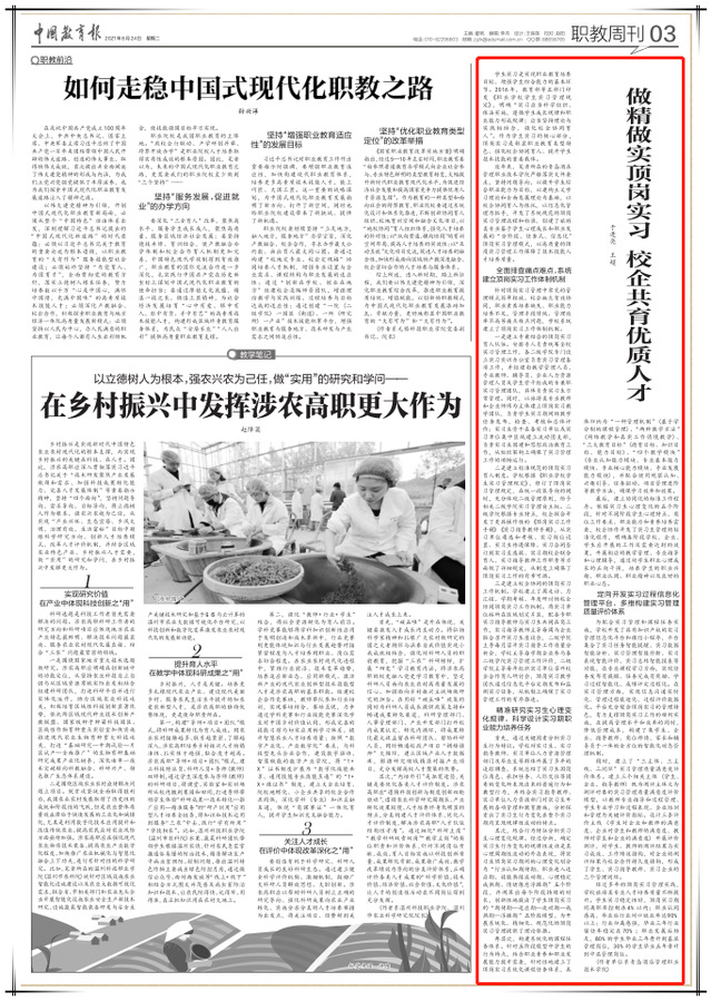 本网讯(党委宣传统战部)8月24日,《中国教育报》职教周刊(第三版)以《做精做实顶岗实习 校企共育优质人才》为题,报道学院创新顶岗实习管理、强化校企协同育人的经验做法,全文如下: