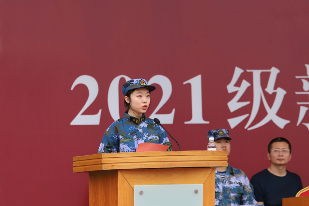 姜玲玲在主持典礼仪式时希望同学们鼓足士气、振奋精神,要不辜青春和朝气,不负韶华和期许,始终保持向前奔跑,感受探索未知的乐趣,圆满完成军训任务,全面规划大学生活,收获属于自己的精彩。