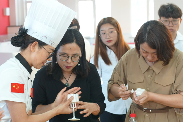 活动中,青岛大学美术学院副院长、青岛市手工艺协会执行会长侍锦教授带来《文化遗产与设计教育》主题讲座,讲座以文化遗产与设计教育为主题,综合阐述了文化遗产的价值,文化遗产的保护和发展、设计教育所面对的问题和解决路径及面对文化遗产应有的态度和责任。青岛市非物质文化遗产代表性传承人王丕文讲解并展示了月饼榼子的制作工艺。学院烹饪学院教师张桂凤带领嘉宾用月饼榼子现场制作月饼。