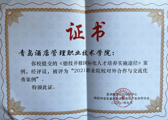 论坛对2021职业院校对外合作与交流优秀案例进行了评选,学院《德技并修国际化人才培养实施途径》案例被评为“2021职业院校对外合作与交流优秀案例”,并成功入选职业教育国际合作典型案例汇编。国际国内主流媒体和教育媒体将对优秀案例进行宣传、报道,进一步提升学院知名度与影响力。