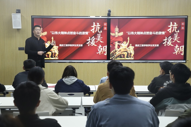 10月24日,学生党支部书记娄帅为全体入党积极分子带来题为《以伟大精神点燃奋斗的激情——抗美援朝大事记》的主题党课。娄帅向大家讲述了中国人民志愿军高举保卫和平、反抗侵略的旗帜,毅然横渡鸭绿江,抛头颅,洒热血,经过艰苦卓绝的战斗,赢得抗美援朝战争伟大胜利的故事,并号召大家铭记历史,缅怀先烈,弘扬传统,争当奋发图强的新时代新青年。