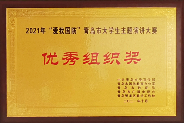 本网讯(学生工作处 朱龙)10月26日,2021年“爱我国防”青岛市大学生主题演讲比赛在青岛科技大学(崂山校区)落下帷幕,学院刘晓同学荣获优秀奖,于友鹏老师荣获优秀指导教师,学院荣获优秀组织奖。
