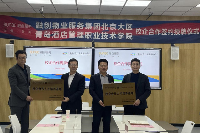 本网讯(酒店工程学院 张进)12月16日,酒店工程学院与融创物业服务集团青岛分公司举行校企合作人才培养基地签约挂牌仪式。