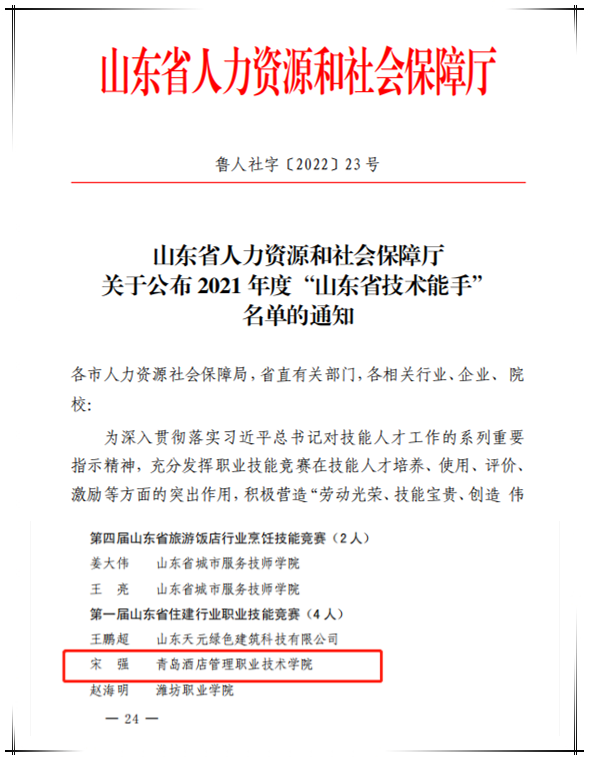 本网讯(酒店工程学院 黄巍林)近日,山东省人力资源和社会保障厅公布了2021年度“山东省技术能手”名单,我院酒店工程学院宋强老师获评“山东省技术能手”称号。