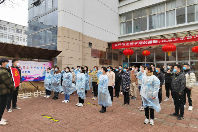 闻令而动,迅速集结。酒店管理学院党总支在校教师党员13人、学生党员16人,组成“疫情防控党员先锋队”,旨在压实工作责任,充分发挥党组织战斗堡垒作用和党员先锋模范作用。党旗所指,就是冲锋所向。大家面对党旗,以校园战疫一线为“授命台”,开展了一场朴素庄重、凝心聚力的成立仪式。党员“亮身份、当先锋”,让党旗飘在疫情防控第一线。