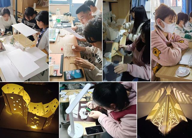 在《立体构成》课堂上,教师传达以美战“疫”、以艺战“疫”的理念,讲授点、线、面、体、空间、材料及构成法则等三维造型的基本要点与技法,引导学生从多角度去剖析塑造物体,从形态、空间、材料、色彩、质感、结构等各方面进行探求,并结合审美和心理,将造型要素按照美的原则组成新的构成作品。学生在学习过程中,锻炼了立体造型思维能力、立体型态表现技巧、三维空间的认知应用能力。学生们的作品风格迥异、表现手法各不相同,运用纸张、木板、泡沫、铁丝、亚克力等原材料,设计并制作出形态丰富、别具内涵的立体构成作品,充分展示出学生们满溢的学习热情和创作活力。