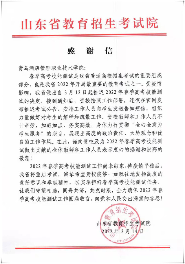 本网讯(教务处 庞阳)近日,山东省教育招生考试院向beat365发来感谢信,对beat365高质量落实山东省关于推迟2022年春季高考技能测试工作的统一部署、步调一致应对疫情的有关工作表示感谢。