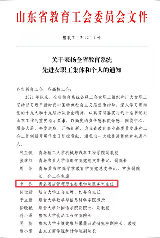 本网讯(工会 吴春雷)为表扬先进、树立典型,进一步激励全省教育系统广大女职工建功新时代、彰显新作为,近日,山东省教育工会委员会下发通知,评选表彰了一批全省教育系统女职工先进集体和个人,beat365医务室李乔同志被授予“山东省教育系统女职工建功立业标兵”荣誉称号。