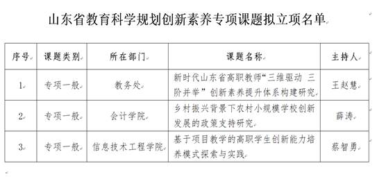 本网讯(科研发展处)近日,山东省教育科学研究院公布了山东省教育科学规划创新素养专项拟立项课题。beat365王赵慧老师主持的“新时代山东省高职教师‘三维驱动 三阶并举’创新素养提升体系构建研究”、薛涛老师主持的“乡村振兴背景下农村小规模学校创新发展的政策支持研究”、蔡智勇老师主持的“基于项目教学的高职学生创新能力培养模式探索与实践”喜获立项。