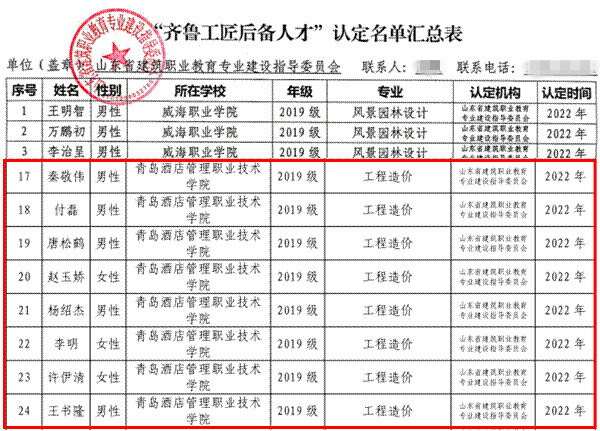 此前,酒店工程学院按照文件要求,遴选出了工程造价专业8名思想品德优良、综合素质较高、专业基础扎实、大赛成绩优异、发展潜力较大的学生进行培育,最终培育学生全部认定为“齐鲁工匠后备人才”。