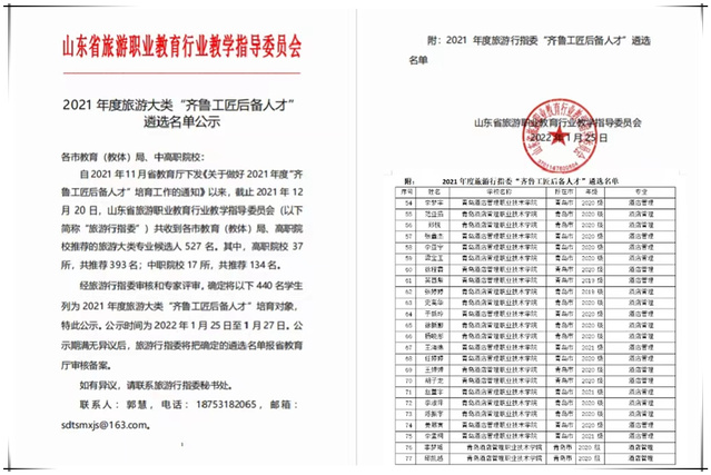 本网讯(酒店管理学院 纪小川)近日,山东省旅游职业教育行业教学指导委员会公示了2021年度旅游大类“齐鲁工匠后备人才”培育对象遴选名单,全省共有440名学生被列为培育对象,beat365酒店管理与数字化运营专业24名学生在列。