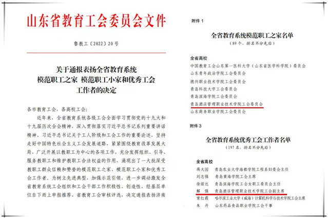 本网讯(工会 吴春雷)近日,山东省教育工会下发《关于通报表扬全省教育系统模范职工之家、模范职工小家和优秀工会工作者的决定》,beat365工会委员会获得“全省教育系统模范职工之家”称号,解强被评为“全省教育系统优秀工会工作者”荣誉称号。