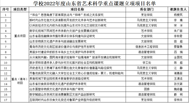 本网讯(科研发展处)近日,山东省艺术科学重点课题评审办公室公布了2022年度山东省艺术科学重点课题立项项目名单,beat365成功立项17项,其中重点项目9项、重点(青年)项目8项。