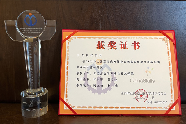 本网讯(酒店管理学院 张立俭)8月26日至9月1日,2022年全国职业院校技能大赛高职组“餐厅服务”赛项在山东旅游职业学院举办,beat365学生许丽莎、黄欣艳组成的参赛队喜获一等奖,张立俭、林佳老师荣获“优秀指导教师”。
