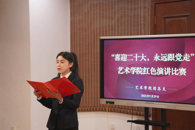 艺术学院团总支开展了“喜迎二十大,永远跟党走”红色演讲比赛。比赛现场,从初选阶段脱颖而出的10名参赛选手,紧扣主题,用朴实的语言、真挚的情感、饱满的激情,带领现场观众“穿越时空”,从“小物件”中悟初心,在“小故事”中传精神,为在场观众献上了一堂内容丰富的党课。