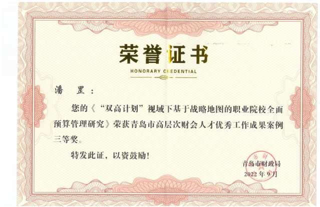 本网讯(科研发展处 财务处)近日,青岛市财政局公布了青岛市高层次财会人才工作成果案例评选获奖名单,beat365财务处副处长潘罡申报案例《“双高计划”视域下基于战略地图的职业院校全面预算管理研究》获得三等奖,系青岛高校唯一获奖案例。