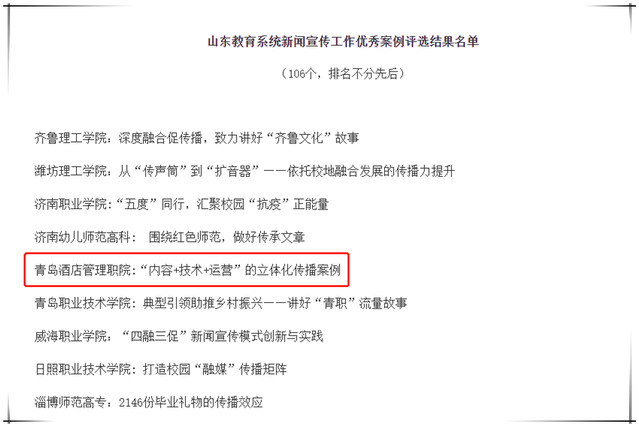 此次评选由山东省教育厅主办,全省各市、各高校自主申报参评案例246个。经专家网评、会议评审等环节,评选出106个案例为全省教育系统新闻宣传工作优秀案例,其中高职院校优秀案例22个。