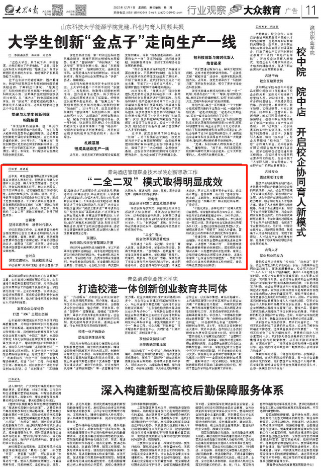 “党建引领、思政铸魂”的引领作用日益增强。学校荣获全国职业教育先进单位等荣誉,入选国家“双高计划”,获批国家级职业教育教师教学创新团队、国家现代学徒制试点等一大批国家级标志性成果。荣获上合组织青岛峰会志愿服务先进单位,连续6年荣获“山东省五四红旗团委”。思政工作荣获山东省高校思想政治工作创新奖、青岛市高校思想政治创新奖。(陈赞 周晓莉)