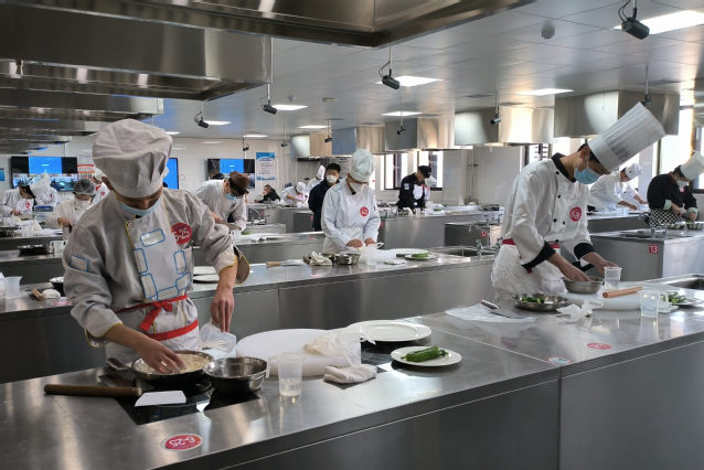考试中,考生根据要求在规定时间内按照试题要求进行操作,完成中式烹调、中式面点两个项目的技能测试。