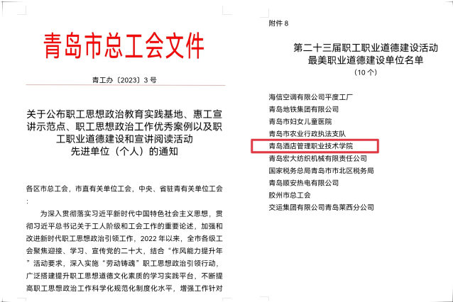 本网讯(工会 吴春雷)近日,青岛市总工会下发《关于公布职工思想政治教育实践基地、惠工宣讲示范点、职工思想政治工作优秀案例以及职工职业道德建设和宣讲阅读活动先进单位(个人)的通知》(青工办〔2023〕3号),beat365荣获青岛市第二十三届职工职业道德建设活动“最美职业道德建设单位”称号。