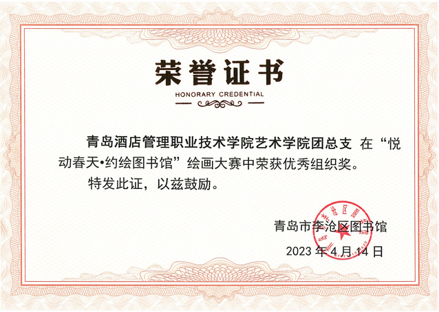 本网讯(艺术学院 于友鹏)4月14日,由青岛市李沧区文化和旅游局指导、李沧区图书馆主办的“悦动春天·约绘图书馆”绘画比赛颁奖仪式举行,艺术学院团总支获得优秀组织奖。