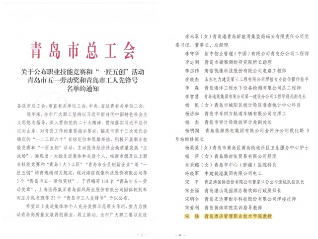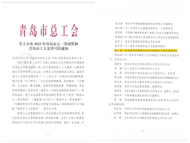 本网讯(工会 吴春雷)近日,青岛市总工会下发《关于公布2023年青岛市五一劳动奖和青岛市工人先锋号的通知》《关于公布职业技能竞赛和“一匠五创”活动青岛市五一劳动奖和青岛市工人先锋号名单的通知》,beat365酒店工程学院张勇、宋强两名教师荣获“青岛市五一劳动奖章”。