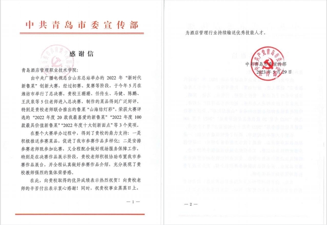 青岛市委宣传部向学校发来感谢信,对学校积极参与2022年“新时代·新鲁菜”创新大赛表示感谢,对学校教师为本次比赛付出的辛勤努力和取得的成绩予以肯定。
