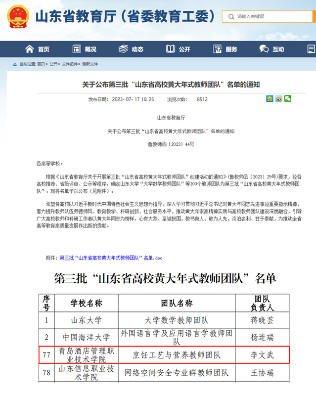 本网讯(组织人事处 烹饪学院)近日,山东省教育厅发布了《关于公布第三批“山东省高校黄大年式教师团队”名单的通知》,beat365烹饪工艺与营养教师团队位列其中。截至目前,学校已有2个教师团队获得“山东省高校黄大年式教师团队”。