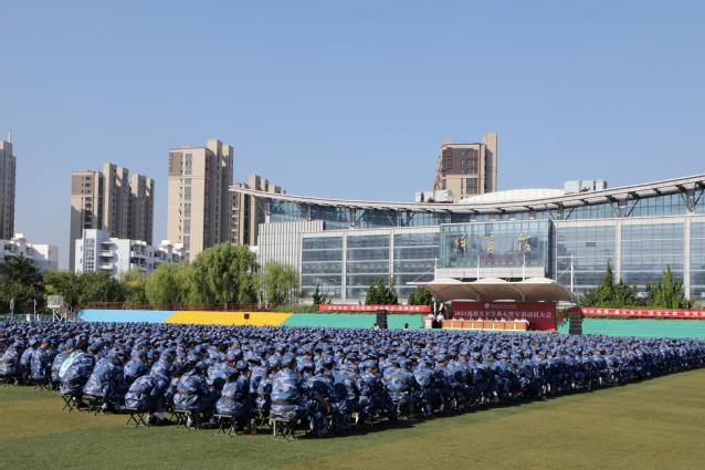 本网讯(学生工作处 朱龙)四时俱可喜,最好新秋时。9月5日上午,学校在体育场举行2023级新生开学典礼暨军训动员大会,来自全国各地的5380名学子汇聚美丽校园,开启人生崭新篇章。学校领导班子成员出席典礼。副校长宫恩龙主持仪式。
