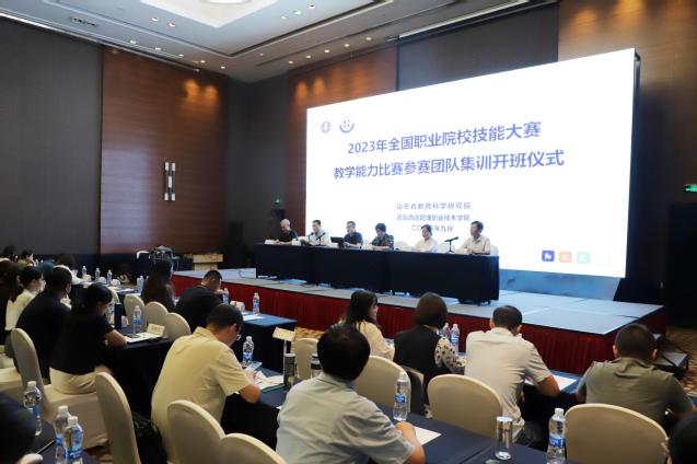 本网讯(教务处)9月14日上午,山东省2023年全国职业院校技能大赛教学能力比赛参赛团队集训开班仪式在青岛世园假日酒店举行。山东省教育科学研究院职业教育研究中心主任李寿冰,济南职业学院校长尹元华,学校校长姜玉鹏、副校长张宗国参加活动。开班仪式由张宗国主持。