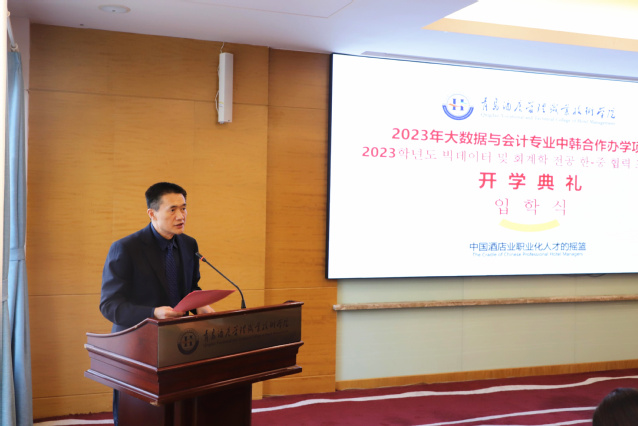 仪式上,韩西清为2023级中韩合作办学班学生赠送开学礼物,中韩双方教师代表共同为学生们佩戴校徽,教师及学生代表分别发言。仪式后,新罗大学国际交流与合作处副处长吴起涛为学生们带来职业规划与学业指导主题讲座。