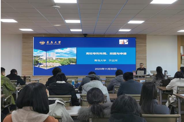 本网讯(科研发展处 刘淑青)11月30日下午,科研发展处特邀青岛大学知识产权学院院长于正河教授到校举办题为“高校专利布局、挖掘与申请”的学术讲座。副校长张宗国主持讲座。