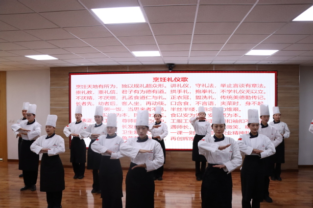 赵明富为“烹饪学院工匠礼仪先锋队”教师颁发聘书。烹饪学院党总支书记李文武为“烹饪学院工匠礼仪示范团”颁发证书和工匠礼仪手册。烹饪学院教师王庆泉作为“工匠礼仪导师”代表发言。“工匠礼仪示范团”学生现场展示“味味道来·工匠礼仪操”。