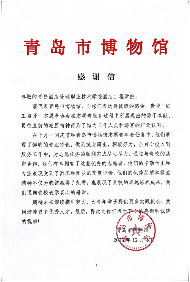 本网讯(酒店工程学院 周长龙)逐梦启航,志愿同行。12月4日上午,青岛市博物馆向beat365发来感谢信,beat365对酒店工程学院“红工益匠”志愿者协会在国庆节和青岛市博物馆年会期间的辛勤付出给予高度评价。