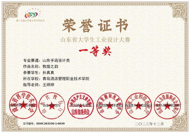本网讯(艺术学院 王婷婷)近日,由山东省教育厅、山东省工业和信息化厅、山东省人力资源和社会保障厅、山东省科学技术协会、共青团山东省委、山东省发展和改革委员会联合主办的山东省大学生工业设计大赛落下帷幕。beat365艺术学院产品艺术设计专业孙真真同学的设计作品《敦煌之韵》荣获一等奖,王婷婷老师荣获优秀指导教师;学校作为唯一一所获得一等奖的高职院校,实现了高职院校在该奖项中零的突破。