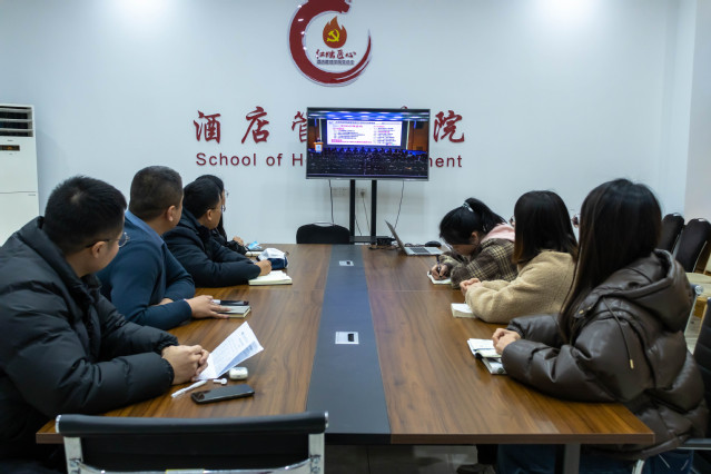 学校相关职能部门负责人、各二级学院党总支书记和学生代表在学术报告厅主会场听讲,学校教职员工和其他年级学生同步收看网络直播。