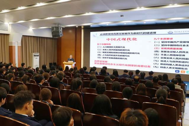 李达从“必须把坚持高质量发展作为新时代的硬道理”“学校高质量发展取得新成效”“主动融入高质量发展的时代洪流”三个章节展开授课,从“中国式现代化”这一逻辑起点出发,结合时代特色和自身经历,讲明了高质量发展的科学内涵,讲述了学校高质量发展的生动实践,讲透了青年学生思想铸魂、素养致远、技能强基、安全托底、健康护航的成长路径,殷殷嘱托、谆谆教诲,鼓舞同学们努力成为担当民族复兴大任的时代新人,在实现中华民族伟大复兴的征程中谱写青春之歌。