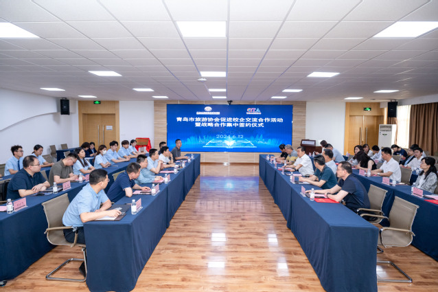 本网讯(文旅学院 李涛)6月12日,学校与青岛市旅游协会及13家头部文旅企业在行政楼四楼会议室举行战略合作签约仪式。青岛市旅游协会会长辛华龙、党支部书记王建功、13家文旅企业负责人,学校校长姜玉鹏、副校长张宗国参加活动。